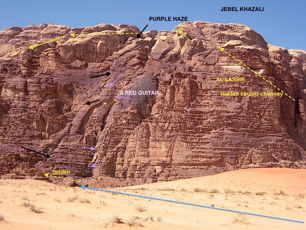 Approach: on 4WD and obvious, via the very first km of Ghôr Ajram by heading to the foot of the North side of Jebel Khazali, on the Northeast flank. A few meters by foot on deep sand can avoid silting up…. You enter the hidden corridor that constitutes the route (see photo), by climbing up from the left the bastion that hinders its access. The rope is recommended for the last meters.